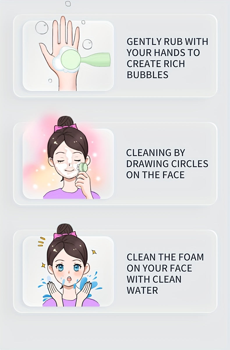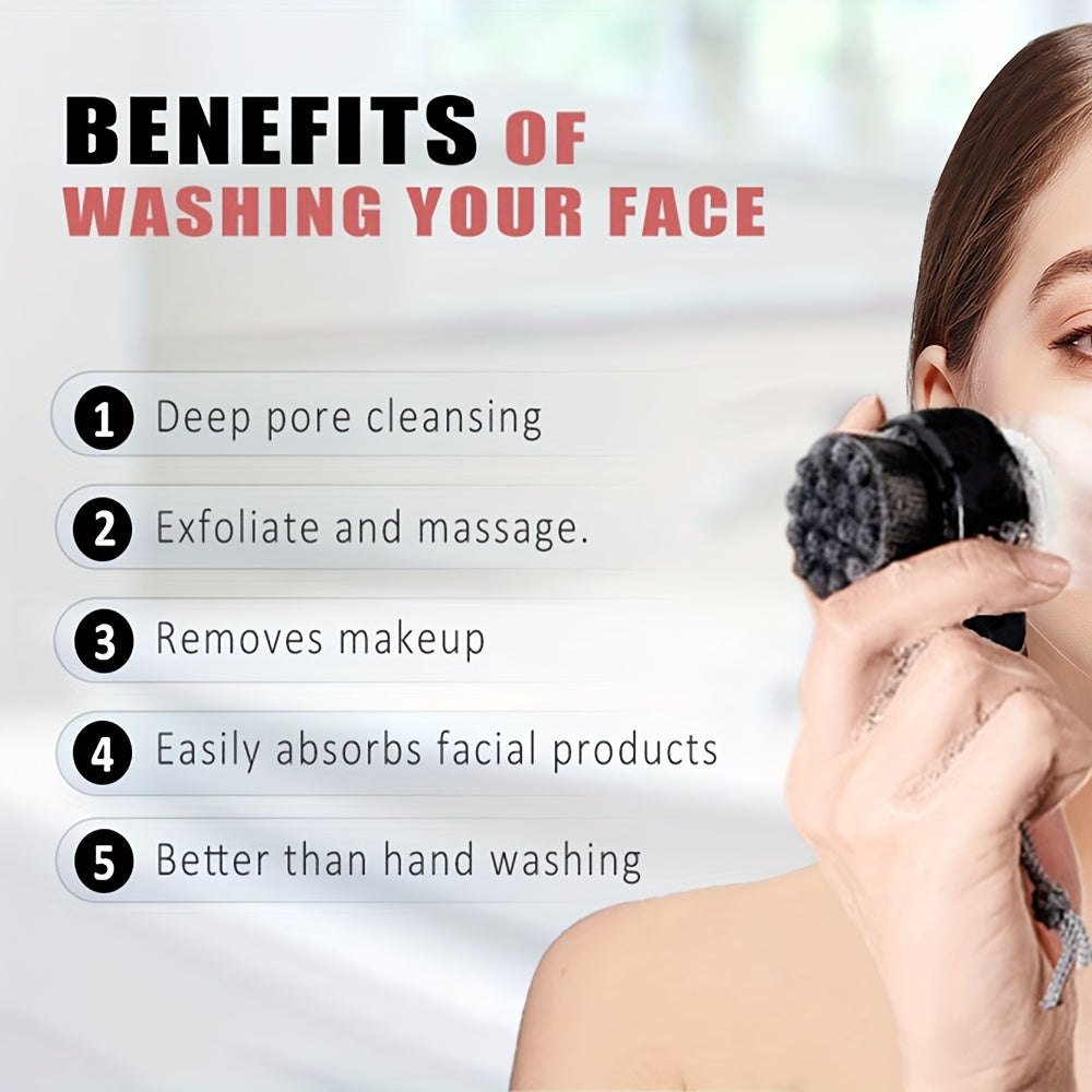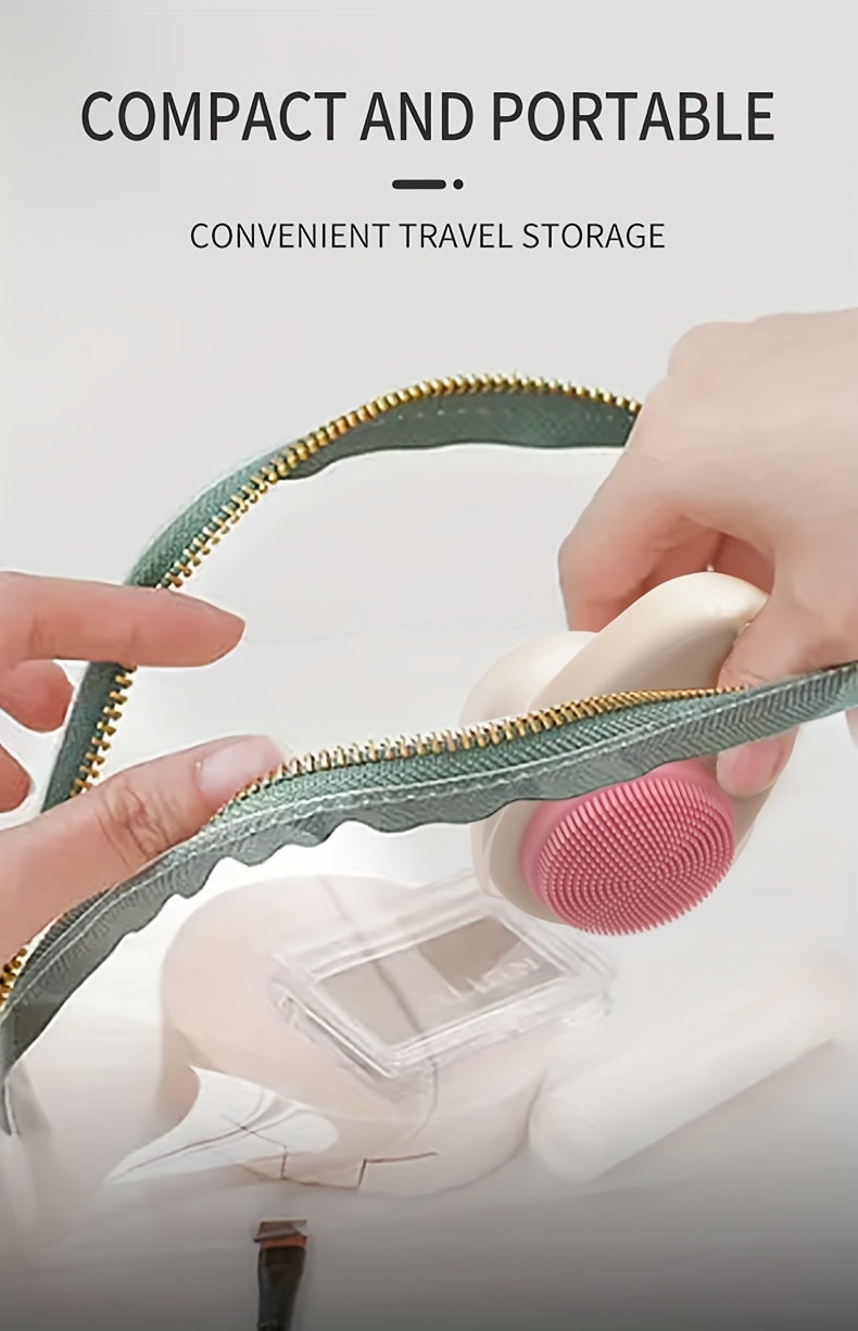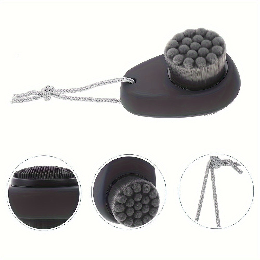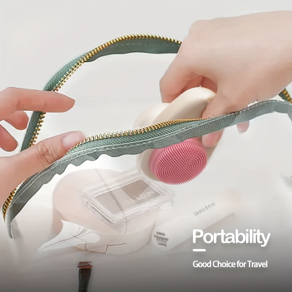 This 2-in-1 dual-sided silicone facial brush is travel-friendly, unscented, and ergonomically designed for gentle deep pore cleansing, exfoliation, and soft facial massage.