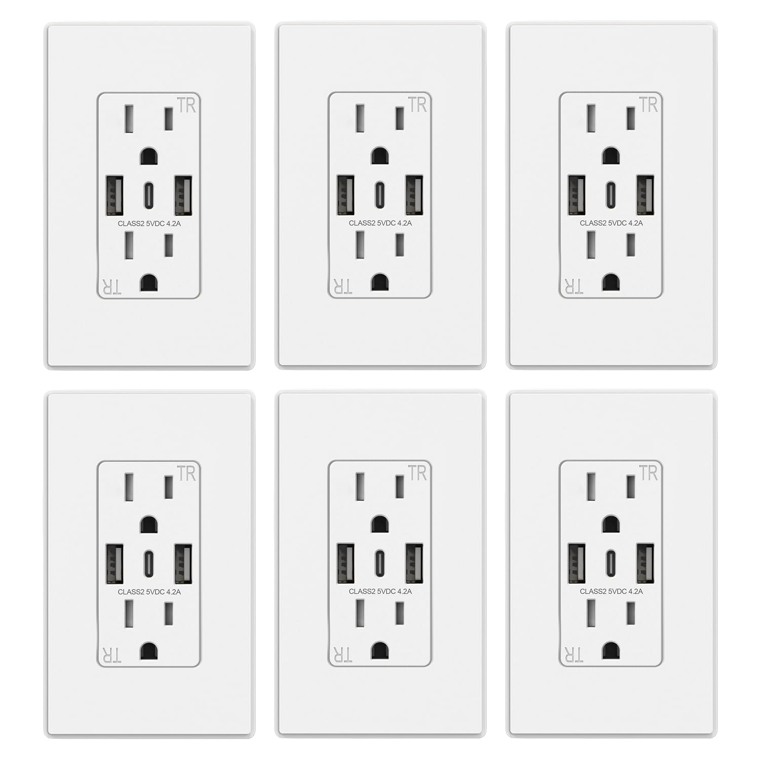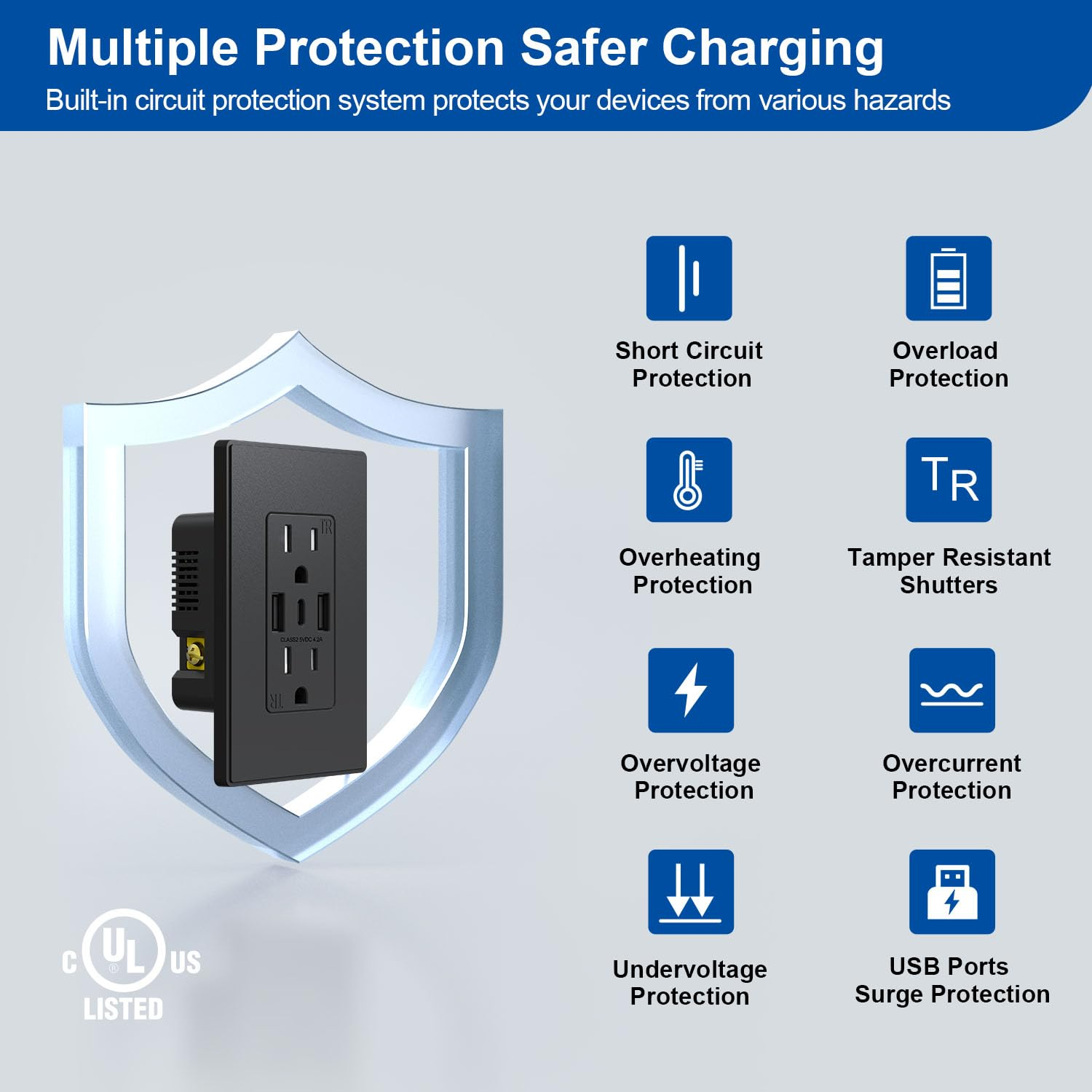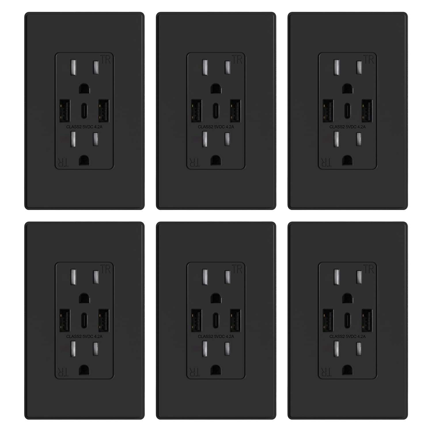 3-Port USB-C Wall Outlet Receptacle, Matte Black, 15 Amp, TR Tamper-Resistant, Screwless Wall Plate Included, UL & CUL Listed, Single Pack