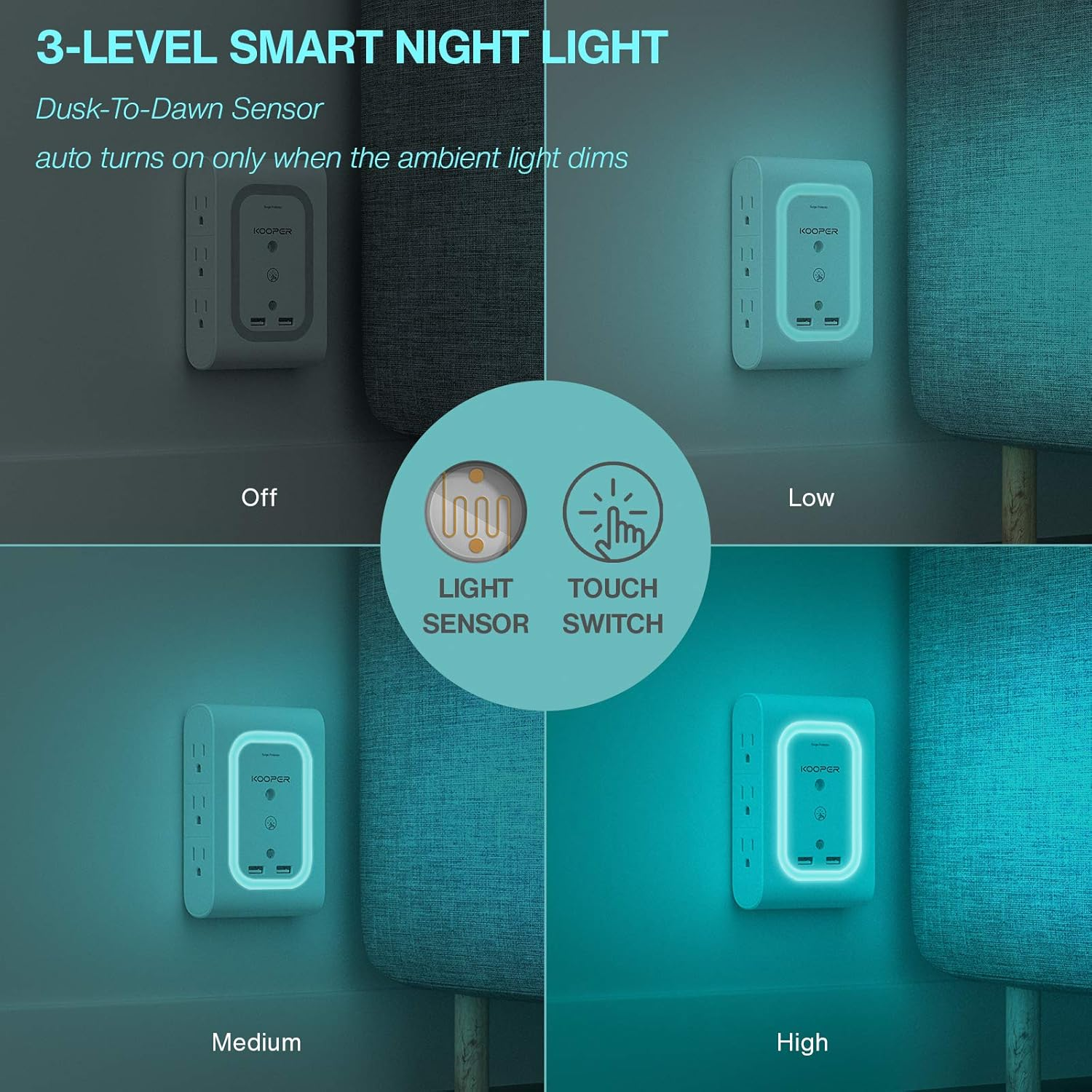 Surge Protector Outlet Extender with Dusk-to-Dawn Night Light, 6-Outlet Adapter and 2 USB Ports, 1080J Wall Mount for Hallway, Stairs, Bathroom, and Kitchen (Ice Blue Light)